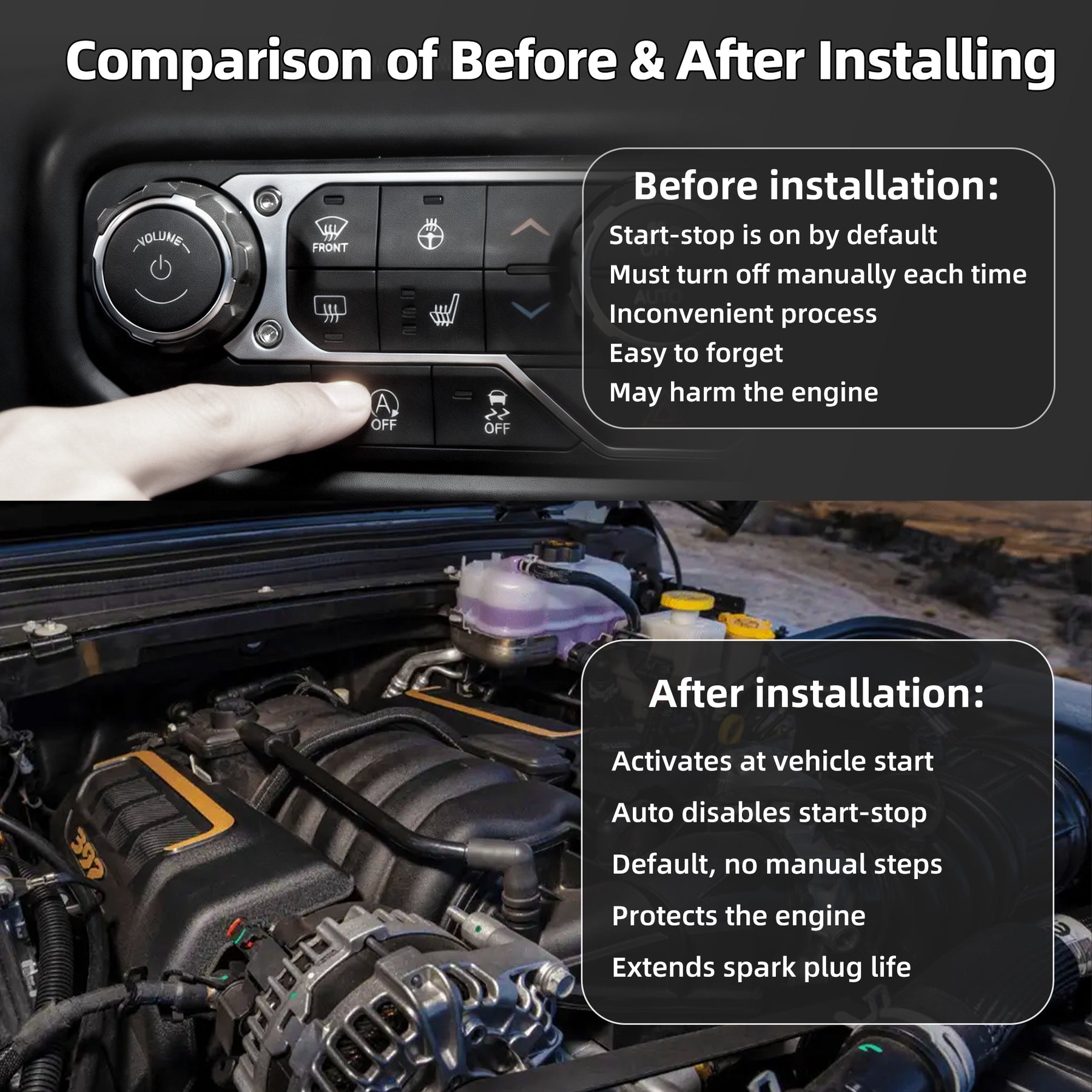 【Mechanical Longevity Protection】- This stop-start disable device helps reduce wear on the starter motor and extends the service life of critical spark plugs. The vehicle protection module prevents the frequent mechanical strain caused by constant engine cycling in heavy traffic or city driving.